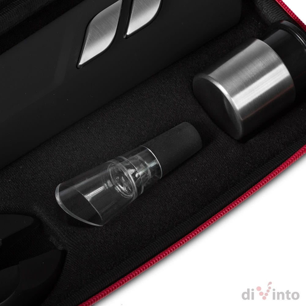 W zestawie znajdziesz wszystko, co niezbędne do właściwego podania wina: elektryczny korkociąg, który w kilka sekund i bez wysiłku otwiera wino, wygodny nożyk do folii ochronnej, nalewak z aeratorem, który pomoże wydobyć z wina pełnię jego smaku, a także stoper z pompką próżniową, który przedłuży świeżość otwartego wina.